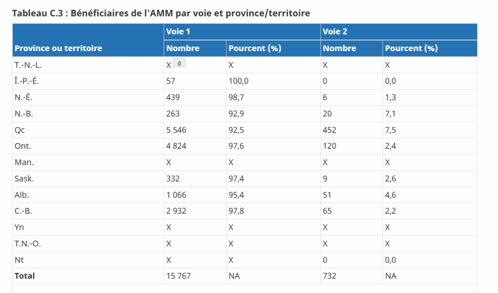 Depuis 2020, il n’est plus nécessaire d’être en fin de vie pour obtenir l’AMM au Québec. S’il est vrai que ces cas représentent seulement une minorité de toutes les AMM administrées en 2024 (452 des 5 998 AMM au total), il est également vrai et très préoccupant de découvrir que ces cas québécois représentaient 62% (!) de tous les cas canadiens d’AMM lorsque la mort naturelle n’est pas « raisonnablement prévisible » (que l’on appelle « voie 2 »). Selon le 6e rapport annuel sur l’aide médicale à mourir au Canada publié vendredi dernier (tableau C.3), il s’agit aussi de la plus haute proportion d’AMM liées à la voie 2 au pays (7,5% de tous les cas d’AMM au Québec, comparativement à seulement 2,4% en Ontario).