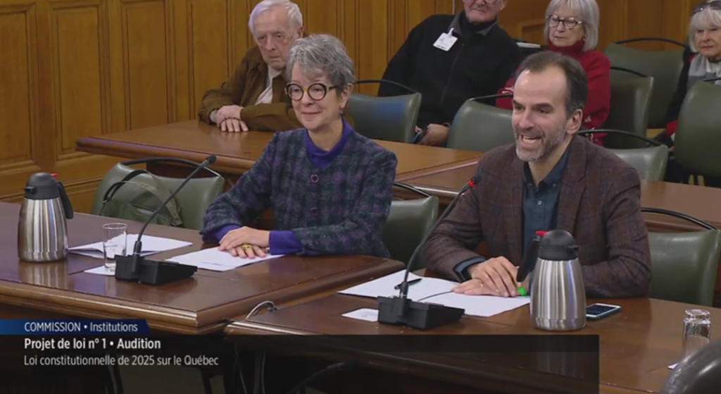 Montréal, 17 décembre 2025 – Vendredi dernier à l’Assemblée nationale du Québec, Vivre dans la Dignité participait aux auditions publiques de la Commission des institutions étudiant le projet de loi 1, Loi constitutionnelle de 2025 sur le Québec. Représenté par son coordonnateur Jasmin Lemieux-Lefebvre et par Madeleine Varkay, membre de son conseil d’administration, le réseau citoyen a dénoncé l’idée d’enchâsser dans une constitution « la protection du droit de mourir dans la dignité et de recevoir l’aide médicale à mourir ».