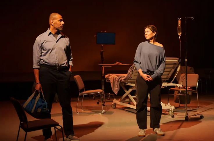 Dans son récit fort en émotions, elle rencontre parallèlement une foule de témoins de l’évolution de la pratique de l’aide médicale à mourir au Québec (les textes proviennent d’entrevues avec des gens bien réels : prestataires d’AMM, juriste, anthropologues, patients, préposée aux bénéficiaires, etc.). Manuelle observe et commente tous ces tableaux où les personnages sont interprétés avec brio par les acteurs Alice Pacual, Sylvie de Morais-Nogueira et Martin-David Peters (le jeu de l’auteure, dont c’est le baptême de la scène, se révèle particulièrement efficace).