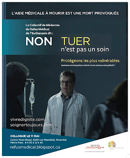 MONTREAL, May 5th 2013 /CNW Telbec/ - The publicity campaign Killing is not healthcare is currently in full swing in the Quebec mainstream media. The Living with Dignity and Collective of Doctors for the Medical Refusal of Euthanasia organisations have joined efforts in order to heighten public awareness to the inherent risks of the legalisation of doctor provoked-death. The Quebec government is actually planning to legalise « medical aid in dying », which in reality is nothing other than euthanasia by another name.