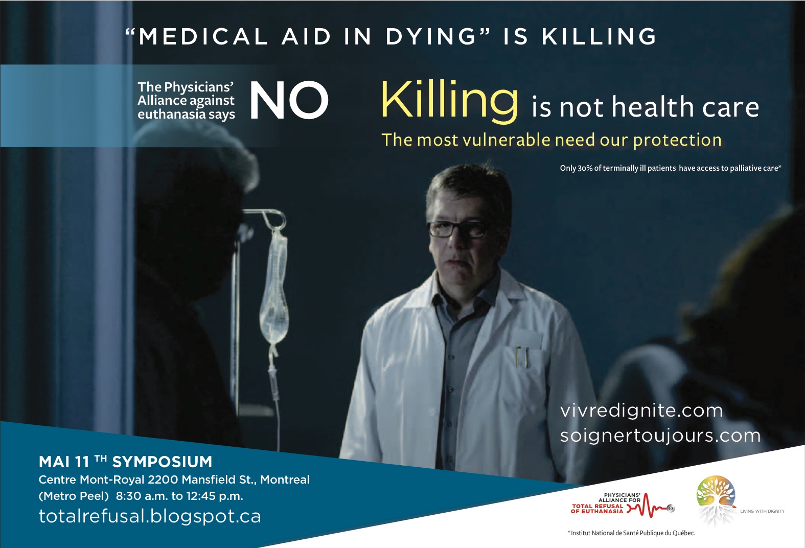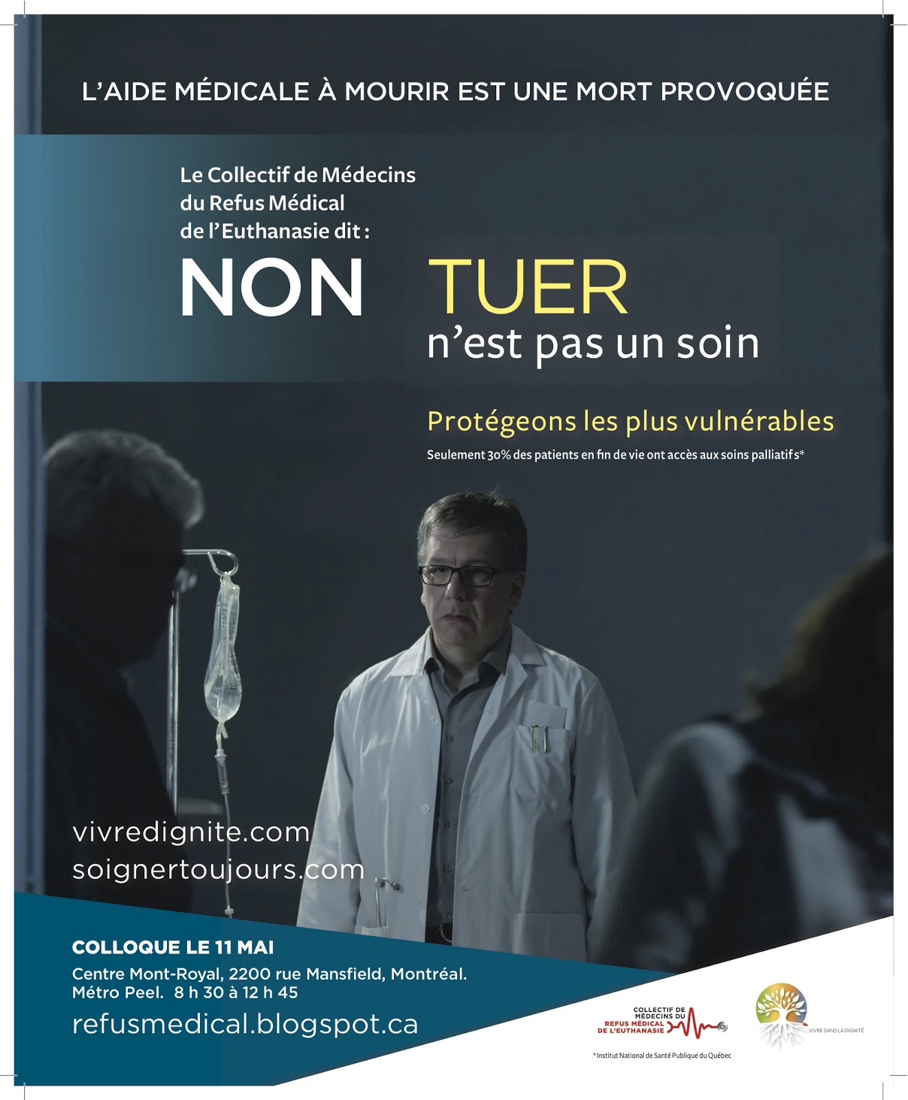 MONTREAL, May 5th 2013 /CNW Telbec/ - The publicity campaign Killing is not healthcare is currently in full swing in the Quebec mainstream media. The Living with Dignity and Collective of Doctors for the Medical Refusal of Euthanasia organisations have joined efforts in order to heighten public awareness to the inherent risks of the legalisation of doctor provoked-death. The Quebec government is actually planning to legalise « medical aid in dying », which in reality is nothing other than euthanasia by another name.