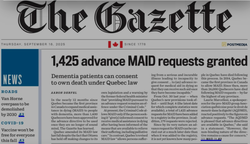 Un article du journaliste Aaron Derfel à la une de la Montreal Gazette et du National Post du jour nous apprend que « depuis le 30 octobre de l’an dernier — date d’entrée en vigueur des nouvelles dispositions au Québec – jusqu’au 4 septembre (dernière date pour laquelle des statistiques complètes étaient disponibles), un total de 1 425 demandes anticipées d’AMM ont été ajoutées au registre de la province. De plus, 179 demandes ont été rejetées.